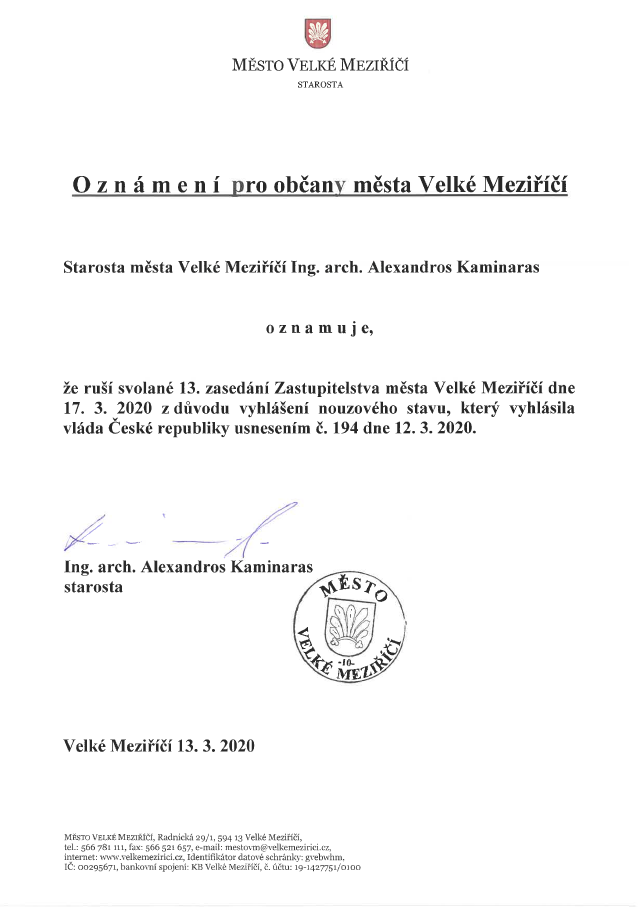 Z důvodu vyhlášení nouzového stavu a zavedení bezpečnostních opatření proti šíření viru Covid-19 ruší starosta města Alexandros Kaminaras svolané 13. zasedání Zastupitelstva města Velké Meziříčí dne 17. března 2020.