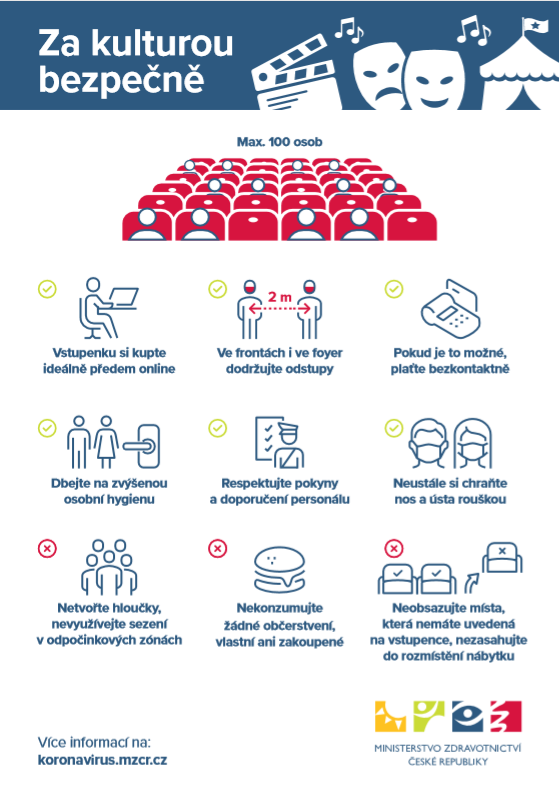 V divadlech bude možné obsadit jen každou druhou řadu. V kinech by měli sedět maximálně dva lidé vedle sebe, od dalších je musí oddělit volné sedadlo.
