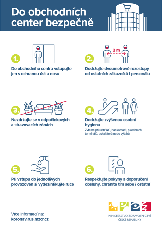 Provozovatelé obchodních centrech zajistí dezinfekci a rozestup lidí 2 metry a řízené fronty. Na dodržování opatření musí dohlížet alespoň jedna odpovědná osoba. V centrech budou k dispozici informační tabule, letáky a pokyny k dodržování rozestupů minimálně 2 metry.