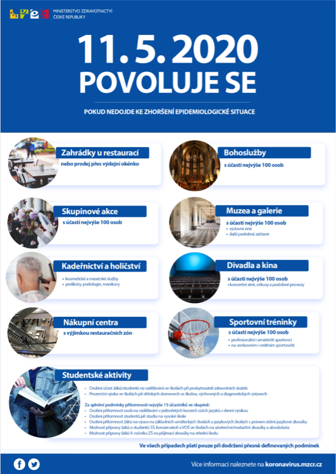 Od pondělí 11. května bude opět možné navštívit obchodní centra, venkovní zahrádky restaurací nebo vyrazit za kulturou. Povoleny budou také hromadné akce do 100 osob, včetně svateb a bohoslužeb. Pro návštěvníky se budou moci otevřít také galerie, muzea či výstavní síně. Navýšena bude také kapacita studijních skupin. Z poskytovaných služeb mohou od 11. května opět začít fungovat holičství a kadeřnictví, masérské služby či manikúry a pedikúry. To vše ale pouze za dodržení přísných hygienických pravidel. Stále platí povinná ochrana nosu a úst, dodržování bezpečných odstupů a pravidelné mytí rukou vodou a mýdlem.