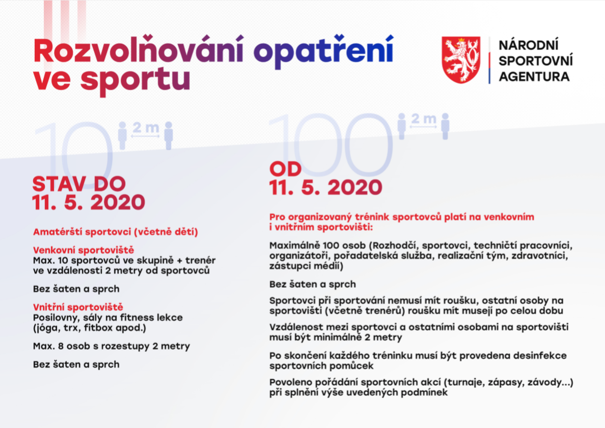 Od 11. května vláda umožní sportování až 100 lidí současně včetně závodů a tréninků, avšak stále bez možnosti využití zázemí s výjimkou toalet.