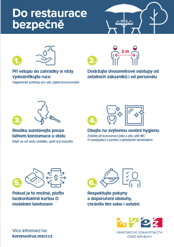 V rámci jednoho stolu mohou sedět i větší skupiny osob. Platí, že ani v restauračních provozech nesmí docházet ke shromažďování osob a při vstupu do vnitřních prostor musí být pro návštěvníky umístěna dezinfekce. Vnitřní prostory restaurací však budou moci být ze strany zákazníků využity pouze za účelem toalety.