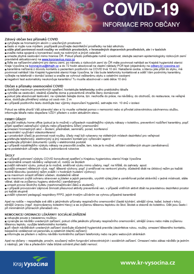 Ve čtvrtek 11. září se sešla Bezpečnostní rada ORP Velké Meziříčí, aby zhodnotila současnou epidemiologickou situaci. Přestože dle krajských hygieniků zatím není třeba přijímat další mimořádná opatření nad rámec celostátně platných, v případě Vysočiny nejde v tuto chvíli o komunitní přenos nemoci, je důležité nebrat platná nařízení na lehkou váhu a chovat se zodpovědně.