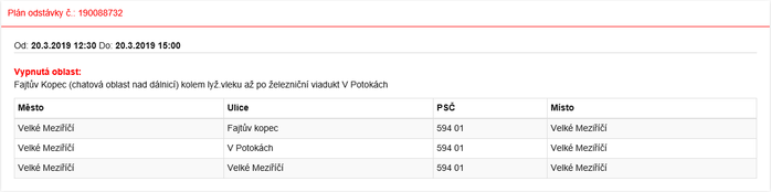 8. 3. 2019Společnost E.ON oznámila plánované přerušení dodávky elektřiny v lokalitě Fajtův kopec (chatová oblast nad dálnicí), kolem lyžařského vleku až po železniční viadukt V Potokách od 12:30 do 15:00. Důvodem je pravidelná kontrola a údržba energetických zařízení.