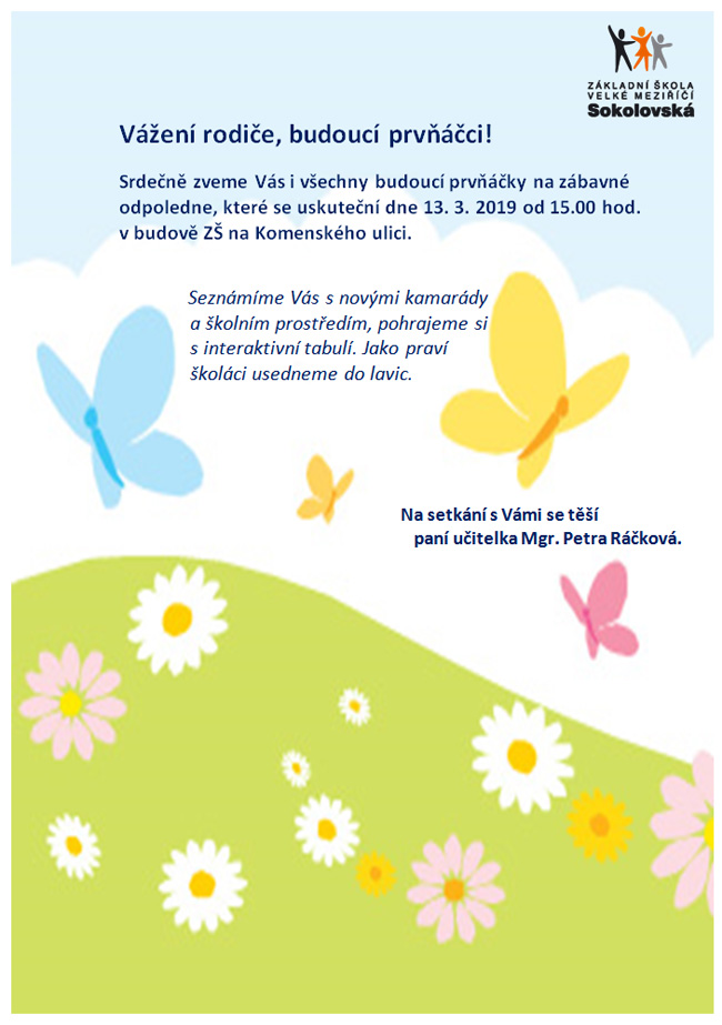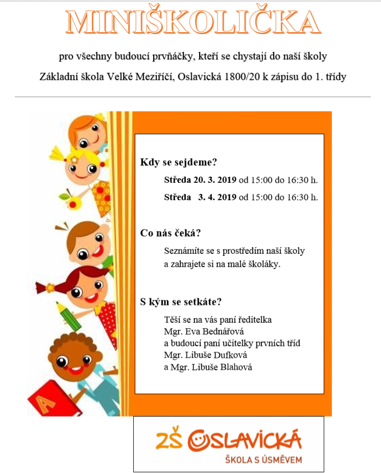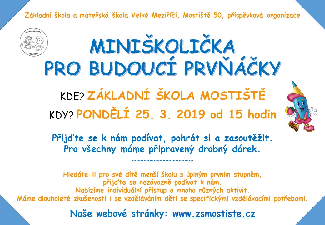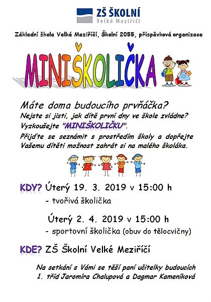 13. 3. 2019Velkomeziříčské a okolní základní školy si připravily miniškoličky pro budoucí prvňáčky. Dne 13. března 2019 od patnácti hodin můžete navštívit miniškoličku na ZŠ Sokolovské v budově ZŠ na ulici Komenského. Miniškoličku při ZŠ Školní můžete navštívit ve dnech 19. března a 2. dubna 2019 vždy od patnácti hodin. Na Oslavické ZŠ si mohou Vaše děti vyzkoušet školní prostředí 20. března a 3. dubna 2019 také vždy od patnácti hodin. ZŠ Mostiště zve na 25. března od patnácti hodin. Zaměření miniškoliček a více informací se dozvíte v přiložených pozvánkách. Na setkání se s Vámi mimo jiné těší budoucí třídní paní učitelky.