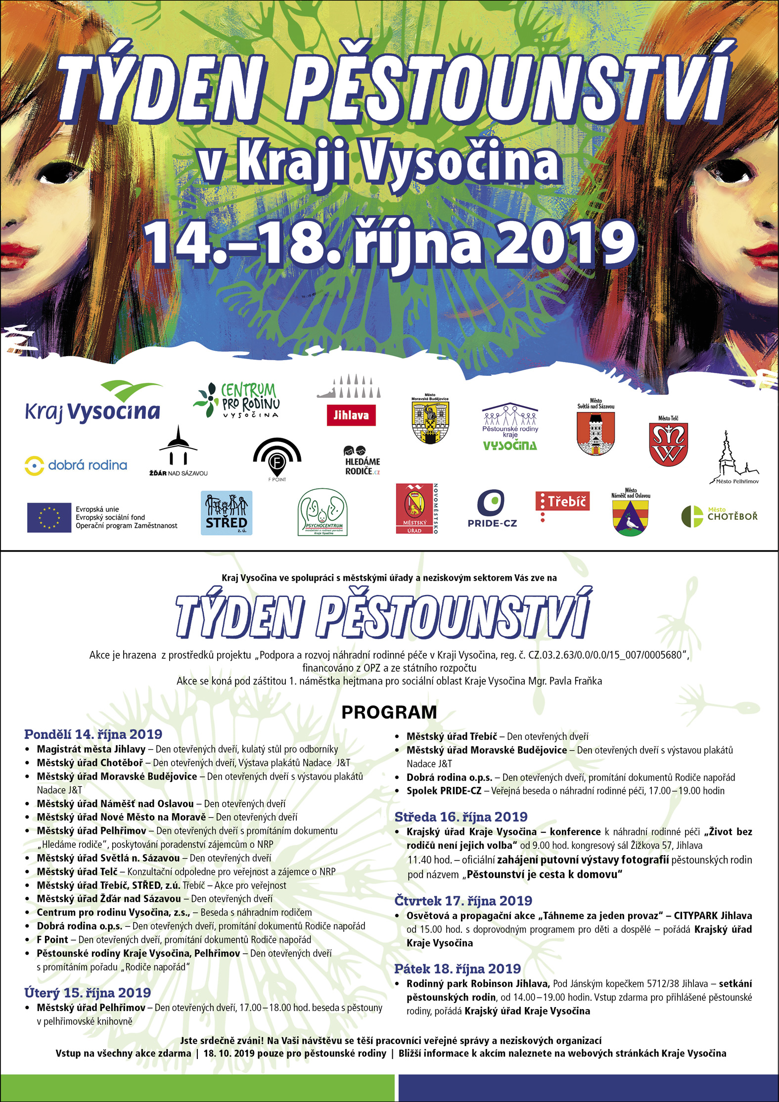„Ve středu 16. října se v kongresovém sále v sídle Kraje Vysočina na Žižkově ulici v Jihlavě uskuteční konference s názvem Život bez rodičů není jejich volba. Diskutovat a předávat zkušenosti si budou náhradní rodiče, odborníci a také další zájemci z řad veřejnosti," uvedla Miluše Průšová z krajského odboru sociálních věcí. O den později se program přesune do nákupního centra Citypark, kde se bude možné dozvědět vše potřebné o procesu zprostředkování náhradní rodinné péče. Akci s názvem Táhneme za jeden provaz, bude moderovat Milan Řezníček a děti se mohou těšit na loutkové divadlo, malování na obličej a nejrůznější kreativní aktivity.