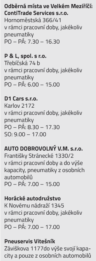 Plánujete přezutí pneumatik a vaše pneumatiky již dosloužily? Nechte je přímo v servisu! Ve Velkém Meziříčí byli řidiči zvyklí vozit staré pneumatiky do sběrného dvora. Tuto službu ale provozovatel dvora k 1. listopadu 2019 zrušil. Občané tak musí začít plně využívat místa zpětného odběru, na kterých odevzdají pneumatiky zdarma. „Ve městě dlouhodobě funguje 5 míst, která pneumatiky bez problému přijímají a mají na to dostatečnou kapacitu. Provozovatel kolektivního systému svozu odmítl v minulosti plošně s technickými službami uzavřít smlouvy. Ve větších městech technické služby nepřijímání pneumatiky již dlouho, u nás ve městě vzniklé náklady platilo město," doplnil jednatel společnosti Jaroslav Mynář.