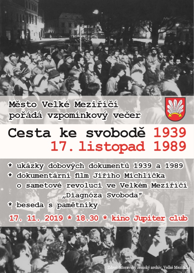 Město Velké Meziříčí vás srdečně zve 17. listopadu 2019 od 18.30 hodin do kina Jupiter clubu na vzpomínkový večer s názvem Cesta ke svobodě.