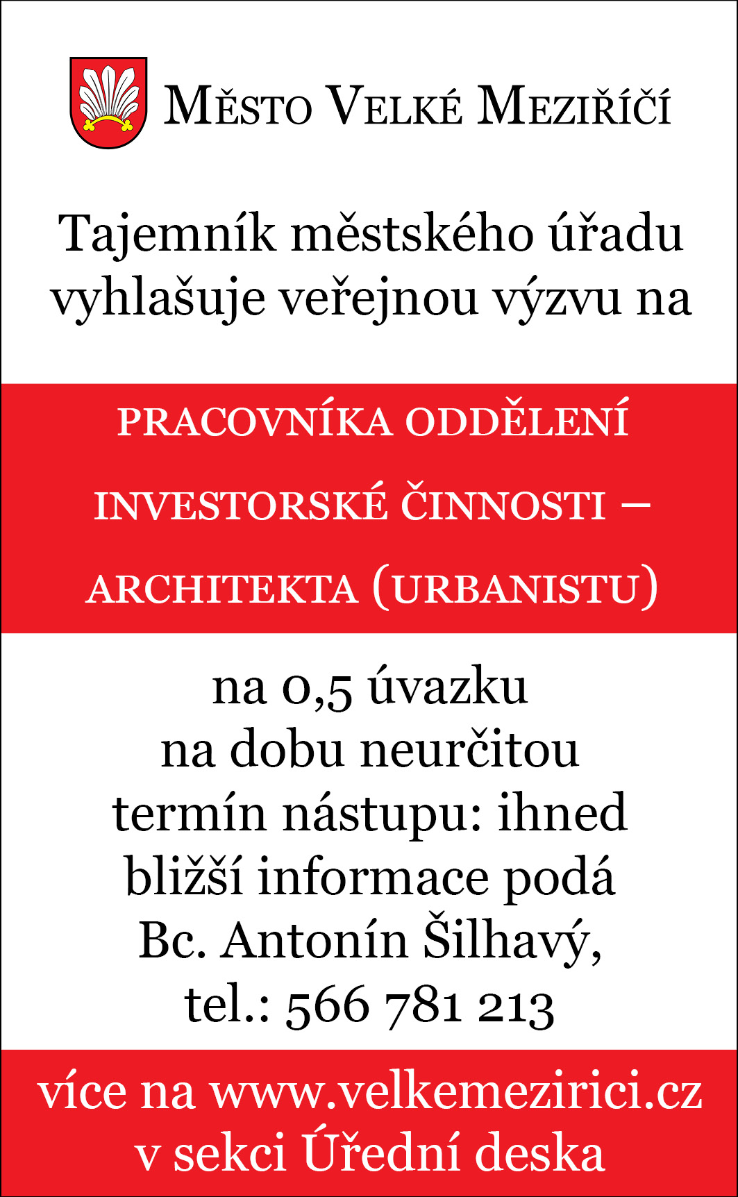 Architekt (urbanista) připravuje architektonická a urbanistická řešení jednoduchých staveb na vymezeném území. Dále řeší například rozmístění obytné výstavby, občanské vybavenosti a služeb. Jedná se o pracovní poměr na 0,5 úvazku s možností nástupu ihned. Podrobné informace, které obsahují vymezení pracovní náplně, požadavky na uchazeče, náležitosti písemné přihlášky a adresu pro její doručení naleznete na úřední desce.