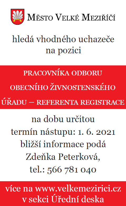 Město Velké Meziříčí hledá vhodného uchazeče na pozici pracovníka odboru obecního živnostenského úřadu – referenta registrace.