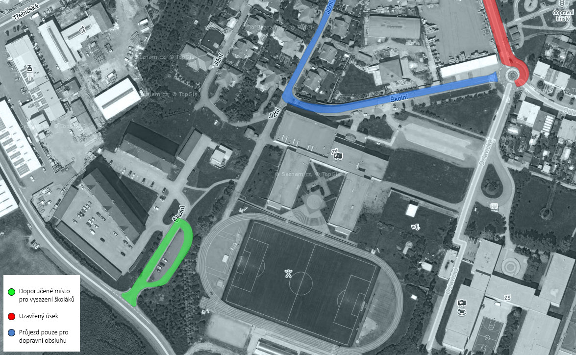 4. 11. 2021Akce Svazu vodovodů a kanalizací Žďársko v ulici Oslavická se blíží ke konci. Stavba však ještě ochromí na pár dní dopravu k základním školám. Od úterý 9. listopadu do neděle 14. listopadu dojde k nutné uzavírce kruhového objezdu. „Po projednání se zhotovitelem bude umožněn průjezd přes kruhový objezd ještě v úterý ráno, cca do 9 hodin," upřesnil místostarosta města František Smažil. Kromě dopravní obsluhy, jež projede po odstranění květináčů ulicí Jižní, se podle vyhlášky nikdo jiný ke školám nedostane. Rodičům, kteří svoje děti do školy musí vozit, doporučujeme zastavit v ulici Školní u hřiště s umělým povrchem (viz mapka). Pokud dojde ke zkrácení trvání uzavírky budeme vás o tom informovat.