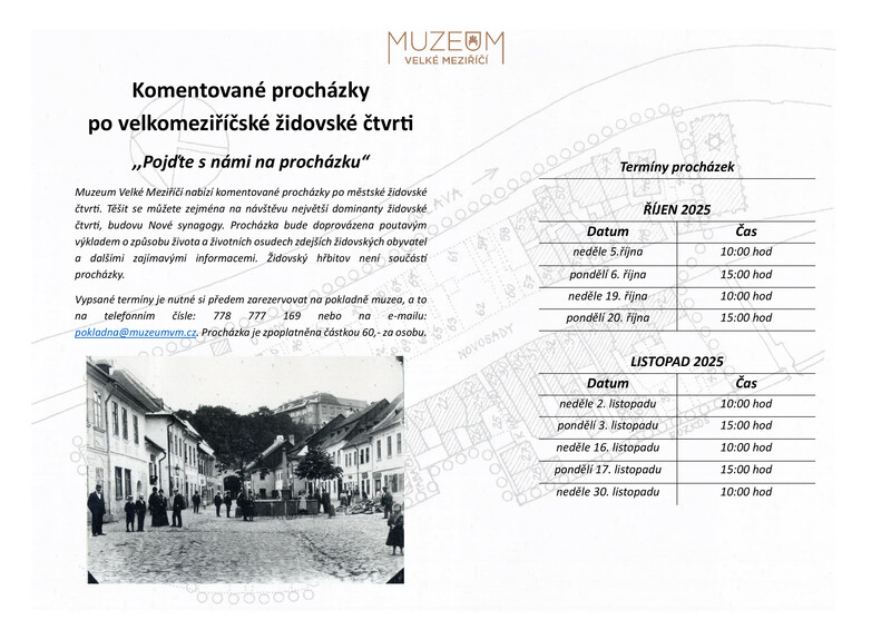 Procházky velkomeziříčskou židovskou čtvrtí budou pokračovat i na podzim. Těšit se můžete zejména na zajímavé informace a příjemnou procházku malebnými uličkami bývalé Dalimilovy ulice, jejímž vrcholem bude návštěva dominanty židovské čtvrti, a to budovy nové synagogy. Stanovené termíny je nutné si předem objednat na pokladně muzea, odkud budou procházky ve stanovených časech také odcházet.