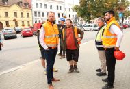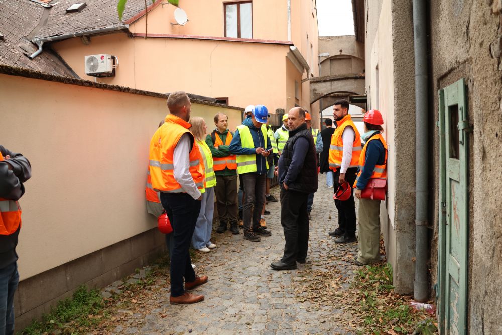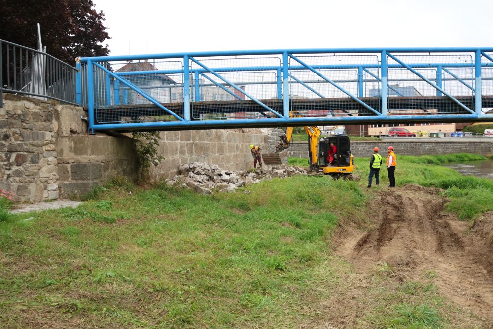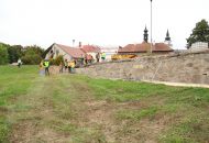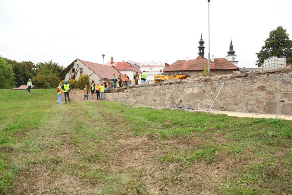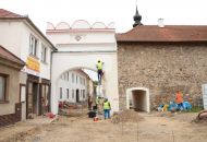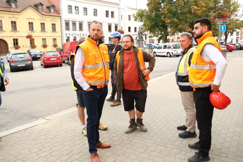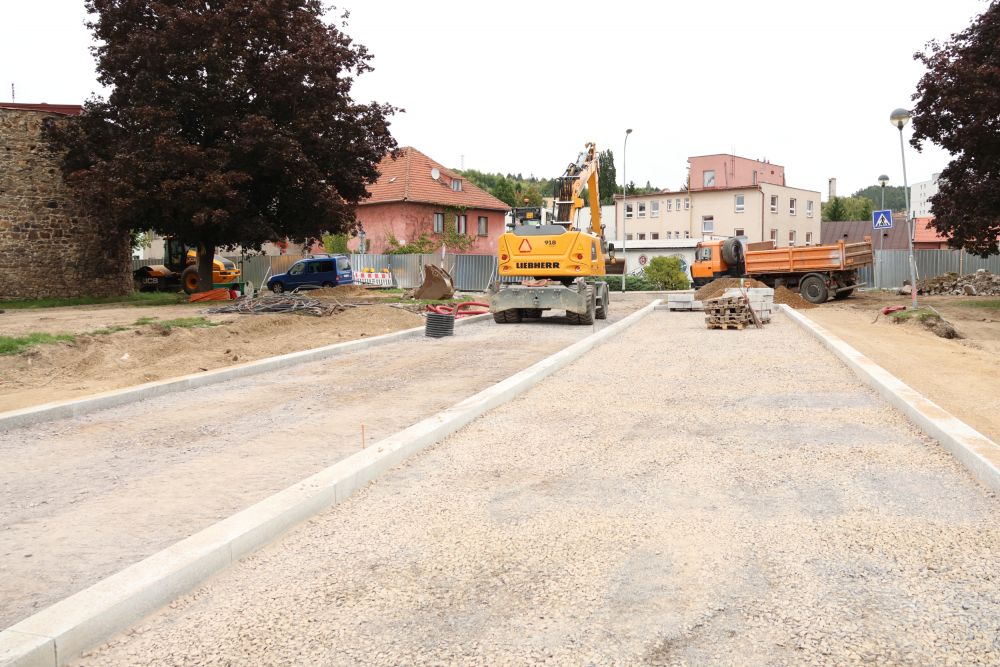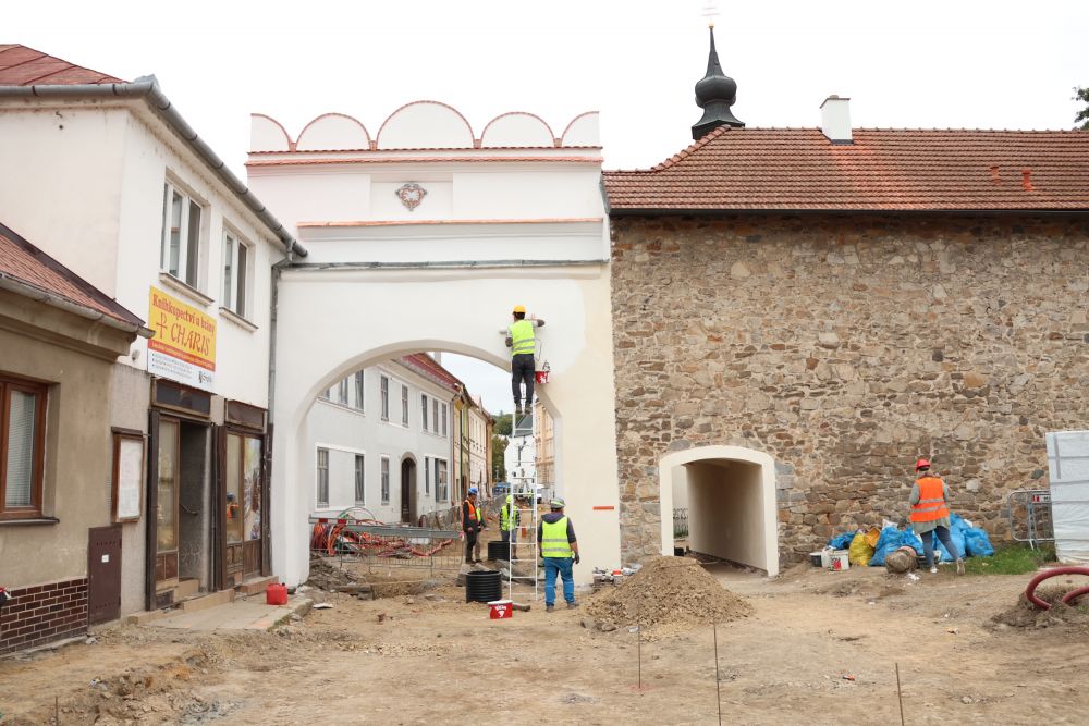 Rekonstrukce náměstí a přilehlých ulic pokračuje. Stavbaři aktuálně pokládají nové obrubníky „na Šebestiánu“ při výjezdu z náměstí, kde poté budou dláždit parkoviště. Současně dokončují výmalbu opravené dolní brány.