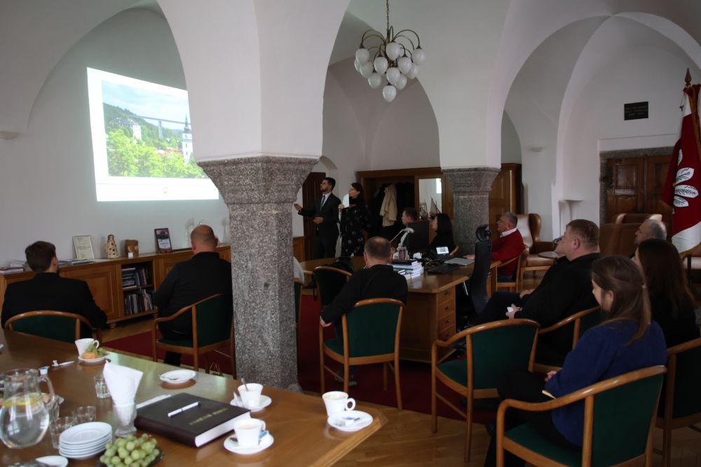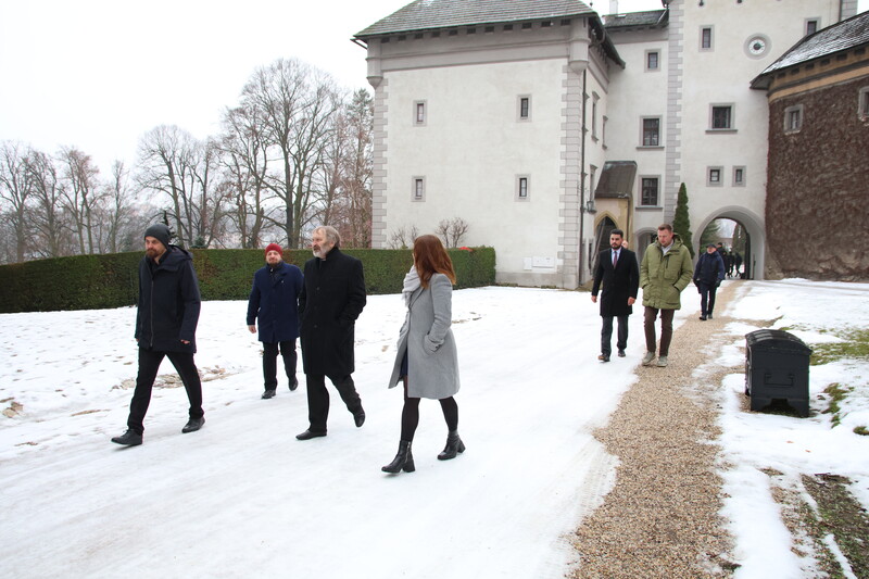 Po setkání na radnici následovala společná prohlídka města. Delegace si prohlédla centrum procházející rekonstrukcí, stavbu městské knihovny i zámek, kde zaujala zejména památka v podobě kapesníčku s krví následníka trůnu a jeho spojitost se začátkem první světové války.