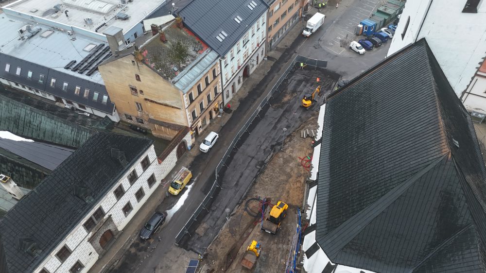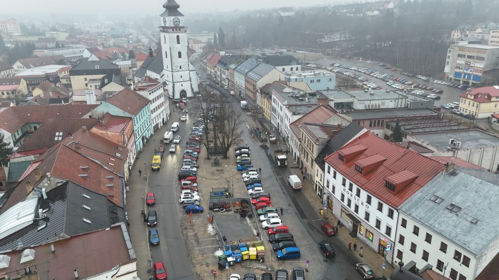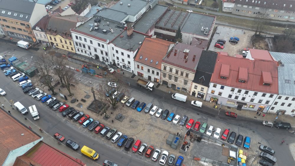 6. 2. 2026V příštím týdnu čeká řidiče na dolní straně náměstí výraznější omezení parkování než dosud. Rekonstrukce kanalizace totiž pokročila k Jupiter clubu, kde kanalizační vedení vybočuje od hrany chodníku do vozovky.