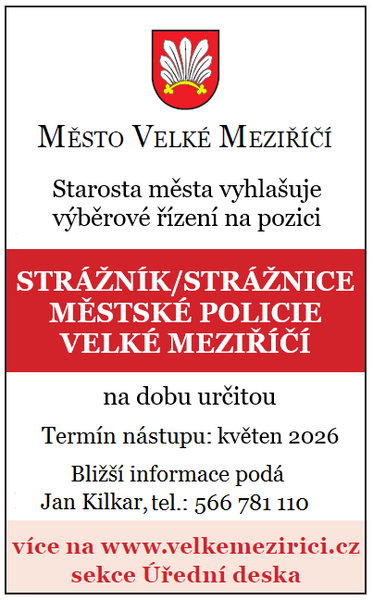 Starosta města Velké Meziříčí vyhlašuje výběrové řízení na pozici strážník Městské policie Velké Meziříčí na dobu určitou (zástup) s místem výkonu práce Velké Meziříčí a zařazením do platové třídy dle platných právních předpisů. Předpokládaná doba nástupu: květen 2026 (dle dohody).