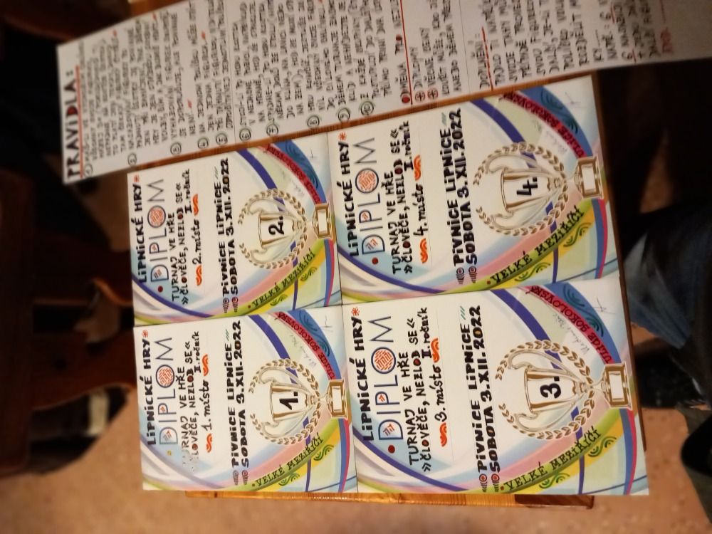V pivnici Na Lipnici, kterou najdete v ulici Sokolovská ve Velkém Meziříčí, se v sobotu 3. prosince uskutečnil II. ročník soutěže ve známé společenské hře Člověče, nezlob se. U každého stolu se vždy sesedly vylosované či přiřazené čtveřice. Zájemcům o účast muselo být více než 18 let a na akci bylo nutné přihlášení předem. Mezi muži se do házení kostkou zapojilo i šest žen. Tentokráte dorazilo také šest borců z Bíteše a dva z Havlíčkova Brodu. Největší zastoupení však mělo pochopitelně domácí Meziříčí.