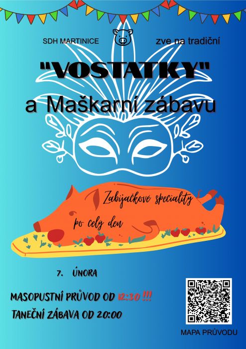 SDH Martinice zve na tradiční "Vostatky" a Maškarní zábavu. Masopustní průvod od 12.30 hod. Taneční zábava…